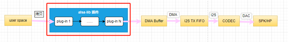 上图中红色框中的部分,每个 alsa-lib 插件 通过预定义的行为(算法),对输入数据进行处理后,输出给下一个插件。