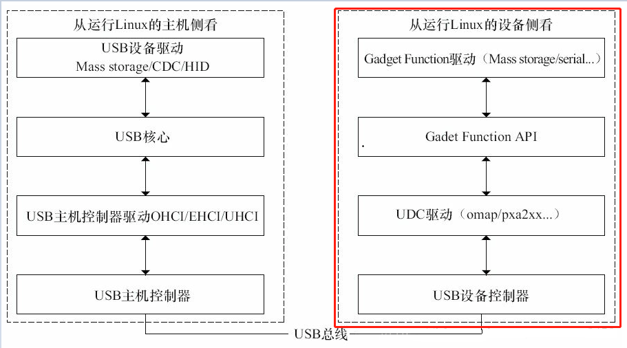 实际上本文重点只涉及上图中右侧红框中的部分,之所以列出左边部分,是想让大家对整个 USB 驱动框架有一个整体认识。左边的部分,不仅限于 Linux,可以是任何支持 USB 主机侧 系统,如 Windows, Mac OS 等其它系统。上图中我们列出的是 Linux 系统,Linux 系统本身既包含 USB 设备主机侧驱动,又包含 USB 设备从机侧驱动(即 USB Gadget 驱动),所以 Linux 自身就形成一个完整的 USB 驱动框架闭环。