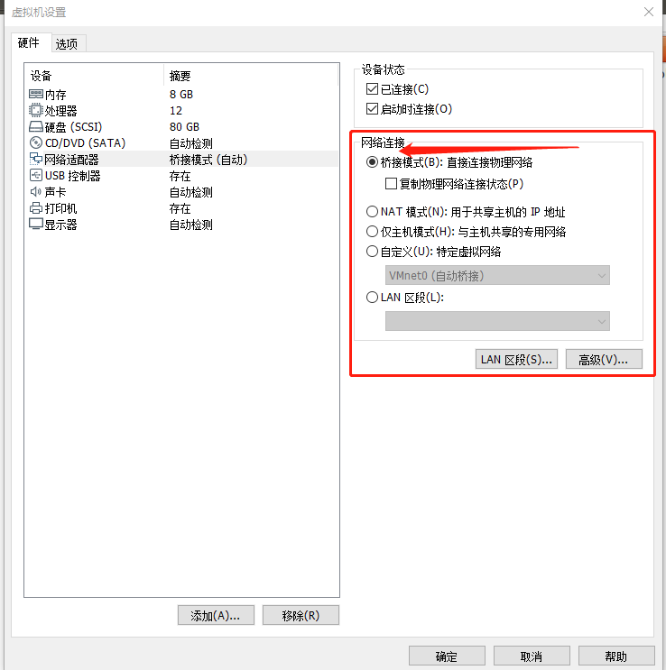 要注意的是,NFS 服务端 和 NFS 客户端 要保持彼此网络联通,否则 mount 无法挂载成功。VMware 的上网方式,最好配置成 桥接方式 ,这样可以让它和主机在同一网段内,这样会便利些。