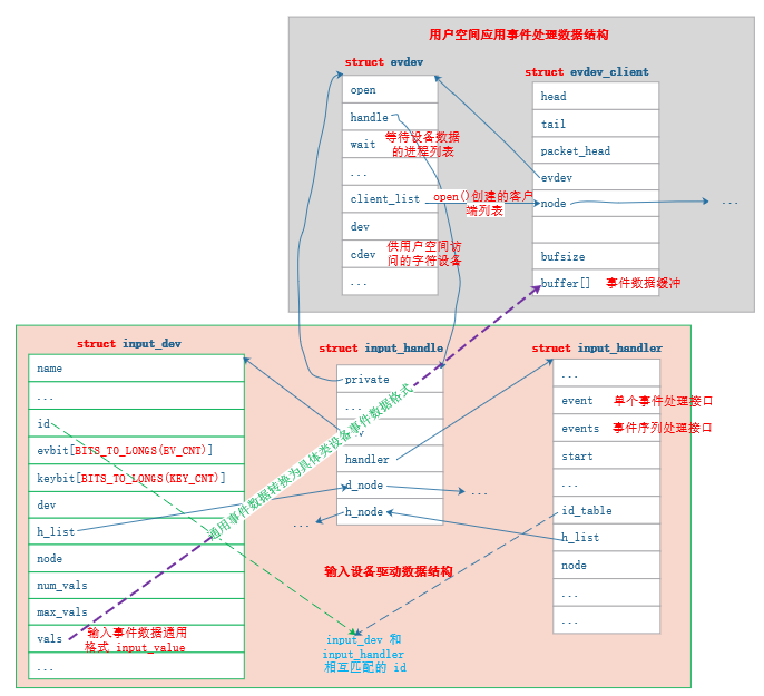 首先是驱动间接或直接通过 input_event() 将事件数据传递给输入子系统,然后输入输入子系统将数据传递给具体类型的事件处理接口,如 evdev_event(), kbd_event(), joydev_event() 等;然后这些接口将通用事件数据格式转换为具体类型的事件数据格式,然后放入用户空间事件数据查询客户端 evdev_client 的数据缓冲,供用户空间应用程序读取。