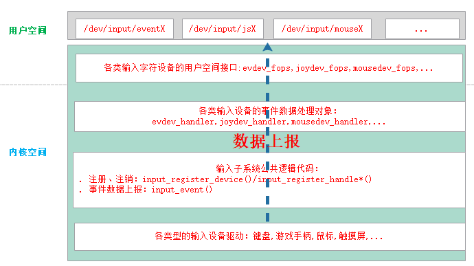 一方面,它向内核空间的输入设备驱动提供数据处理的公共代码逻辑,屏蔽输入设备硬件的实现细节;另一方面,它向用户空间提供输入设备数据访问接口,用户空间应用程序可通过内核提供的访问接口,获取输入设备数据。