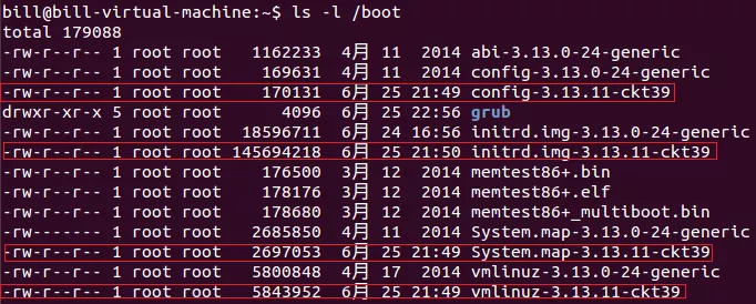 完成内核的安装后可查看/boot/的文件列表,红色框选中的文件是新内核相关文件:
