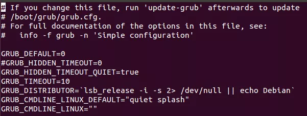 在重启之前,在Ubuntu 14.04.2下需要对grub做简单配置,因为在sudo make install更新grub配置时,默认选择了新安装的内核,而且不显示 grub 菜单项,这意味着你无法选择启动的内核。此时,只需要对 grub 配置作简单修改就好,如下图将配置项GRUB_HIDDEN_TIMEOUT注释掉:
