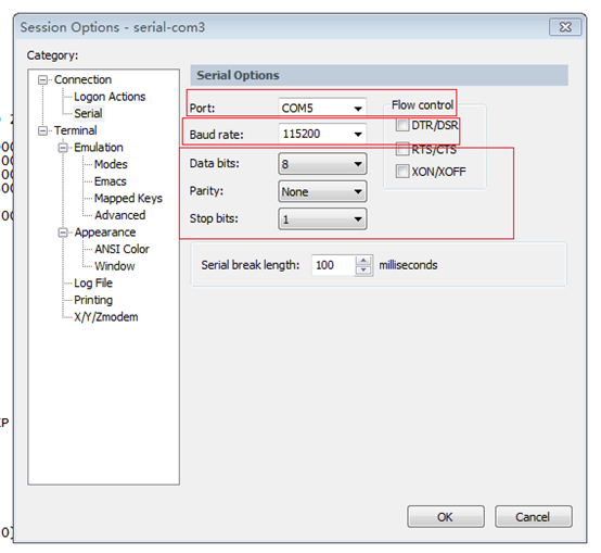 (2) 打开串口工具(以SecureCRT为例),选择目标串口,并按下图配置串口
