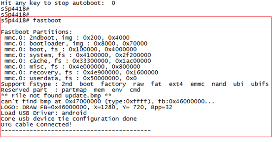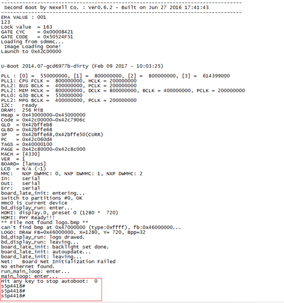 (3) 按住图1中标记的 RESET 按钮,放开 RESET 按钮的同时快速敲击键盘的 Enter 键,直到串口工具中输出如下图红色框中的命令提示符(s5p4418#)