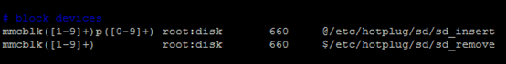 上面的配置中,第 1 列是用来匹配的设备文件名,第 2 列是 uid:gid,第 3 列是文件权限,最后一列带 @ 标识设备加载后执行的动作,带 $ 的标识设备移除前执行的动作。关于更多 mdev.conf 配置细节可参考链接 :mdev