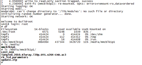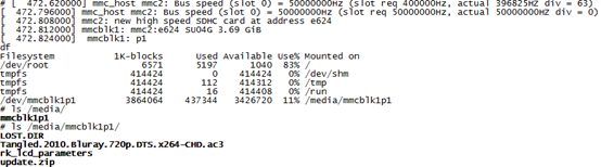 在启系统前,已经将sd卡插入,所以应该可以看到sd卡设备被识别并自动挂载了。启动系统后,运行如下几个命令: