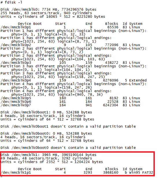 从上图中红框部分,可以看出,挂载的是一个 FAT32 格式,4G 容量的 SD 卡。