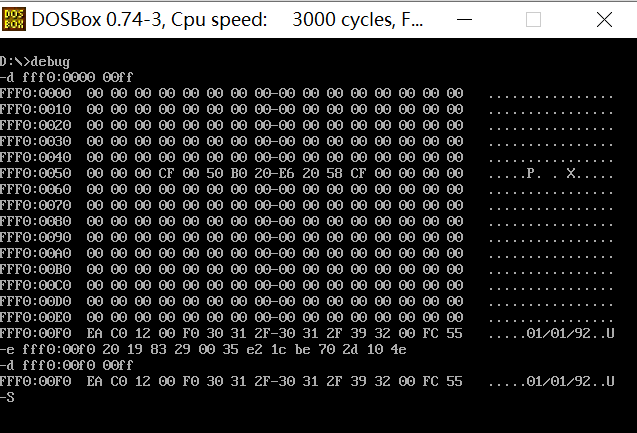 通过debug模式下的d命令,可以找到生产日期存储在内存单元FFF0:00F0到00FF之间,接着使用-e命令尝试对其进行修改后发现该内存单元的值并没有改变。因为该部分内存是ROM内存,即ReadOnly Memory,是不可进行覆写的内存单元,是受到保护的。