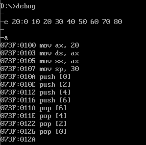 (4) 如果把最后四条指令改成截图中的顺序, pop [6] 指令执行结束后,使用d命令 d 20:0 7 查看此时数据空间内的数据是否有变化。