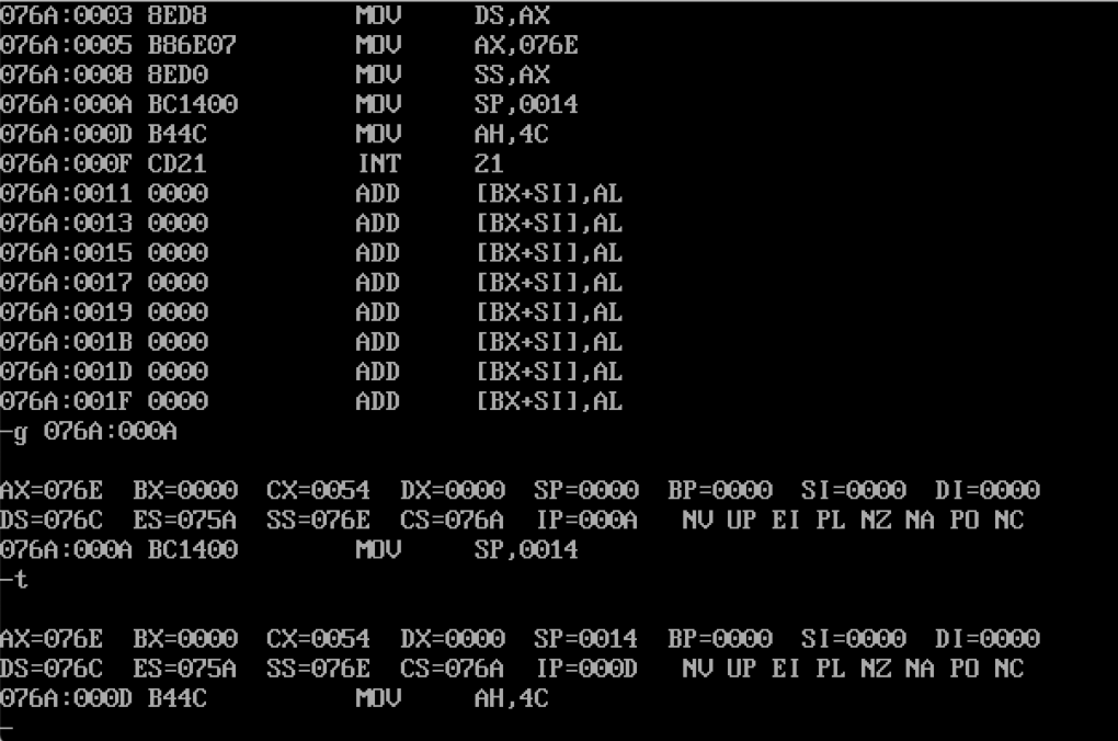 对程序task1_4.asm进行汇编、连接,用debug加载、跟踪调试,基于结果,回答问题。