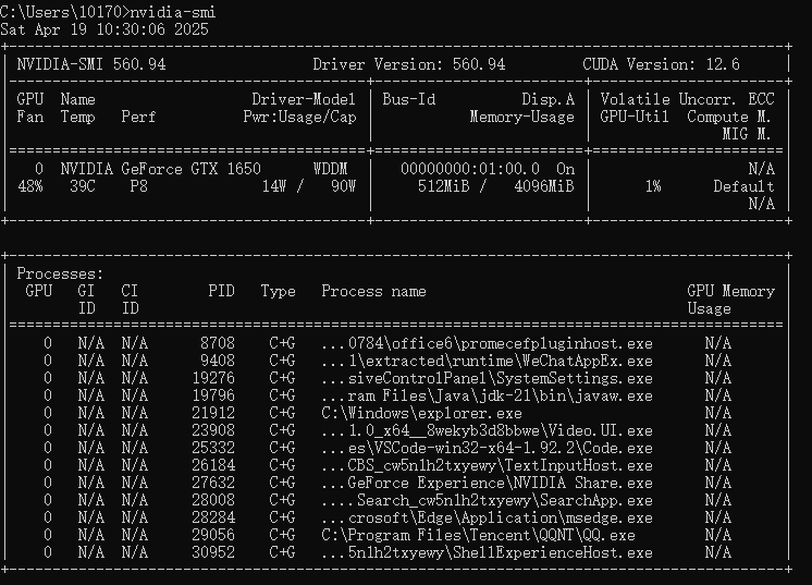 | 0 NVIDIA GeForce GTX 1650 WDDM | 00000000:01:00.0 On | N/A |