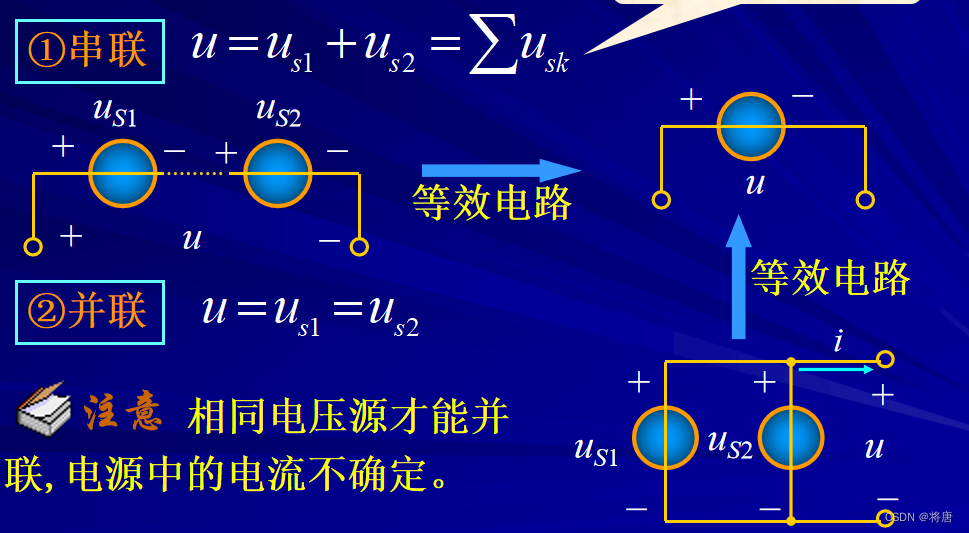 并联时--->相同的电压源才能够并联,电源中的电流不确定(由其本身与外部电路共同确定)