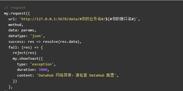 Datahub方案,在小程序的IDE开发环境下,可以通过npm run datahub先启动Datahub,接口层通过my.request方式请求到Datahub平台。