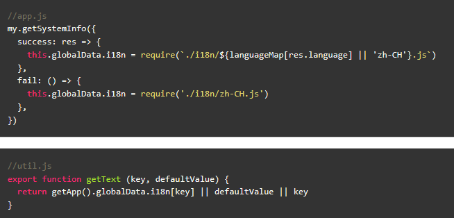 使用:通过小程序App初始化中取得容器App语言信息,完成多语言选择,并保持在全局数据中。在需要地方,完成语言取用。