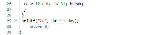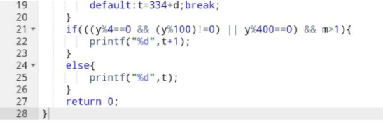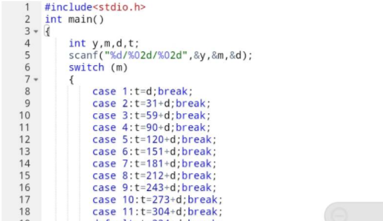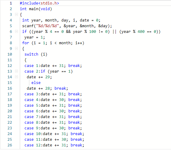 数据表达:本题用了四个整型变量,其中year表示年份,month表示月份,date表示月份的几号,sum表示通过计算得出表示该日是这年的第几天
