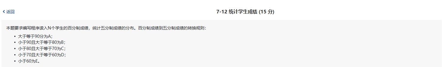数据表达:本题用了九个整型变量,其中A,B,C,D,E用来统计各分段的人数分布,i用来执行循环,n表示人数,m表示每个学生的成绩,result表示m/10并取整,方便以10为一个分段计算人数。