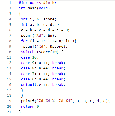 数据处理:本题我运用for和switch句型,for语句进行循环,switch语句进行情况分类,最后 printf("%d %d %d %d %d",A,B,C,D,E);进行输出。
