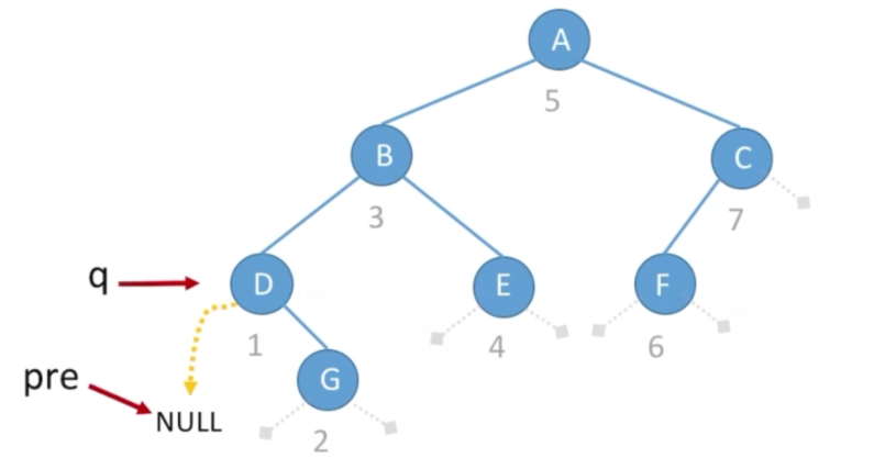 if (q->lchild == NULL) {//左子树为空,建立前驱线索