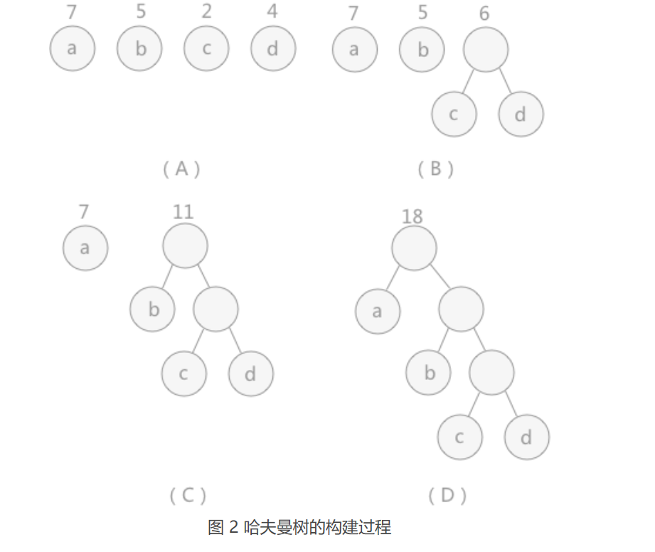 图 2 中,(A)给定了四个结点a,b,c,d,权值分别为7,5,2,4;第一步如(B)所示,找出现有权值中最小的两个,2 和 4 ,相应的结点 c 和 d 构建一个新的二叉树,树根的权值为 2 + 4 = 6,同时将原有权值中的 2 和 4 删掉,将新的权值 6 加入;进入(C),重复之前的步骤。直到(D)中,所有的结点构建成了一个全新的二叉树,这就是哈夫曼树。