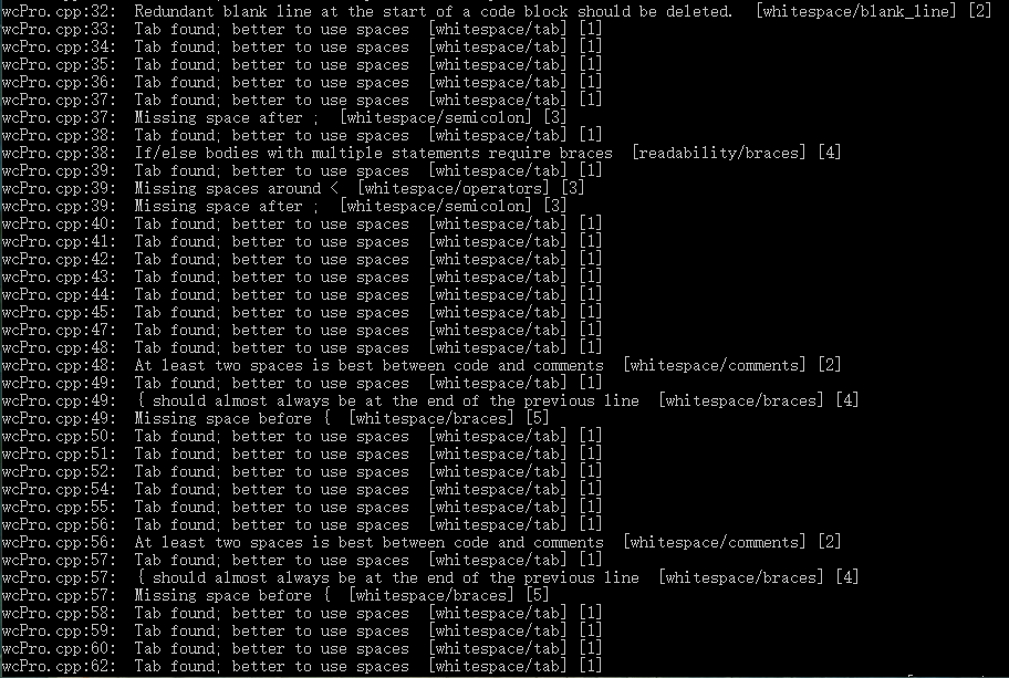 对我个人的代码用Google提供的代码检查工具cpplint做了静态检查,我们参考了Google给出的C++风格指南,并且对所有的代码进行了检查。Google给出的代码规范涉及的范围十分全面,从头文件、命名空间,一直到if……else……语句,到注释、空格、花括号,都给出了详尽的规范。以下是我对自己代码进行静态检查的结果: