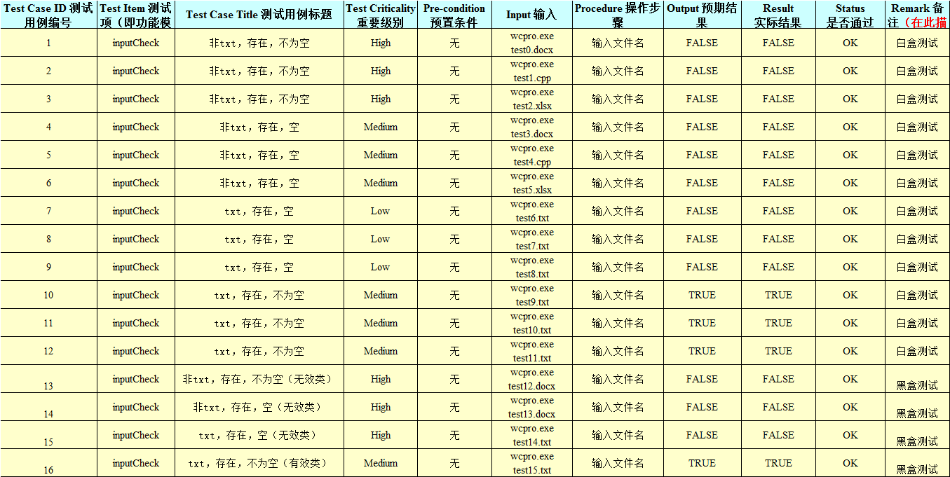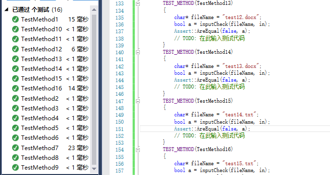 测试评价:做了十六个测试,测试结果和预想一直。利用白盒测试按照测试路径覆盖了所有的判定节点和路径,不同的路径换用了不同的文件进行测试,但没能凑到二十个用例。测试脚本写的比较笨,一个输入对应一个测试方法。