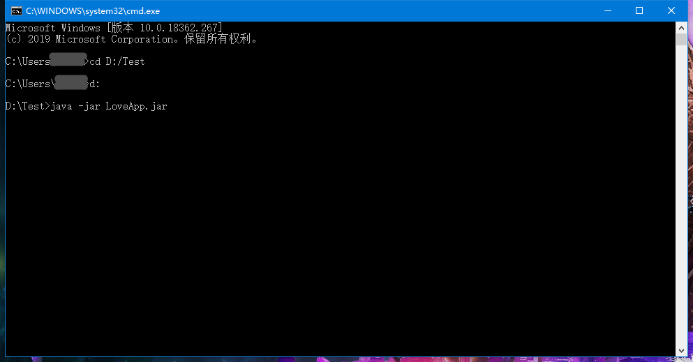 2.CD到jar包路径之下,输入java -jar *.jar(*替换为需启动的jar包名称,本人电脑上测试不区分大小写);