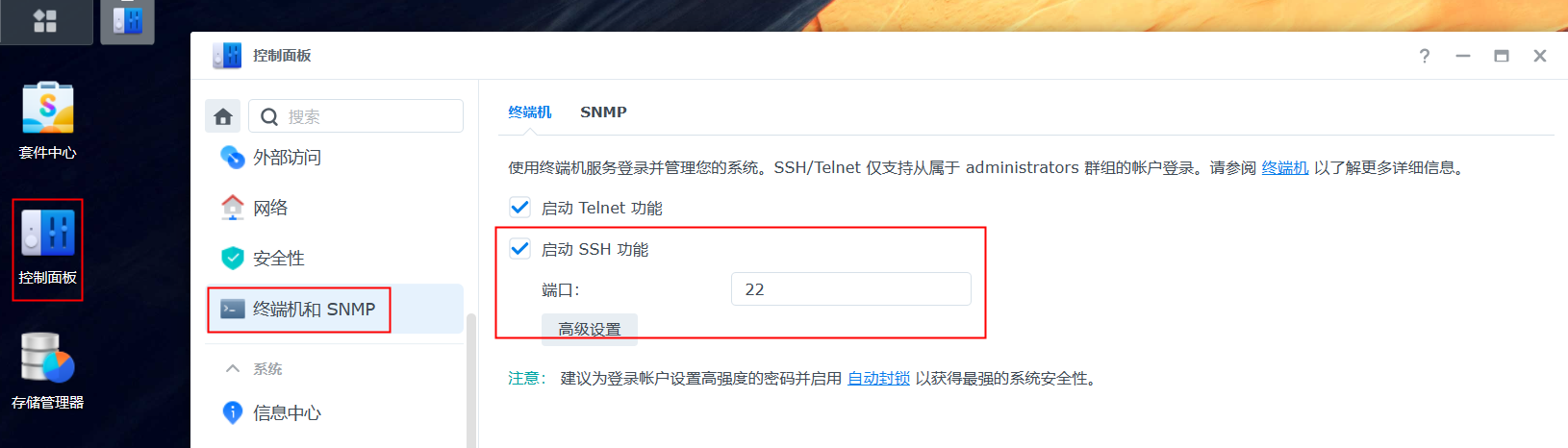 控制面板 - 终端机和SNMP - 启动SSH登录功能,端口就是22
