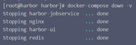 # 进入安装目录 cd /harbor-1.10.3 # 停止并移除整个project的所有services docker-compose down -v