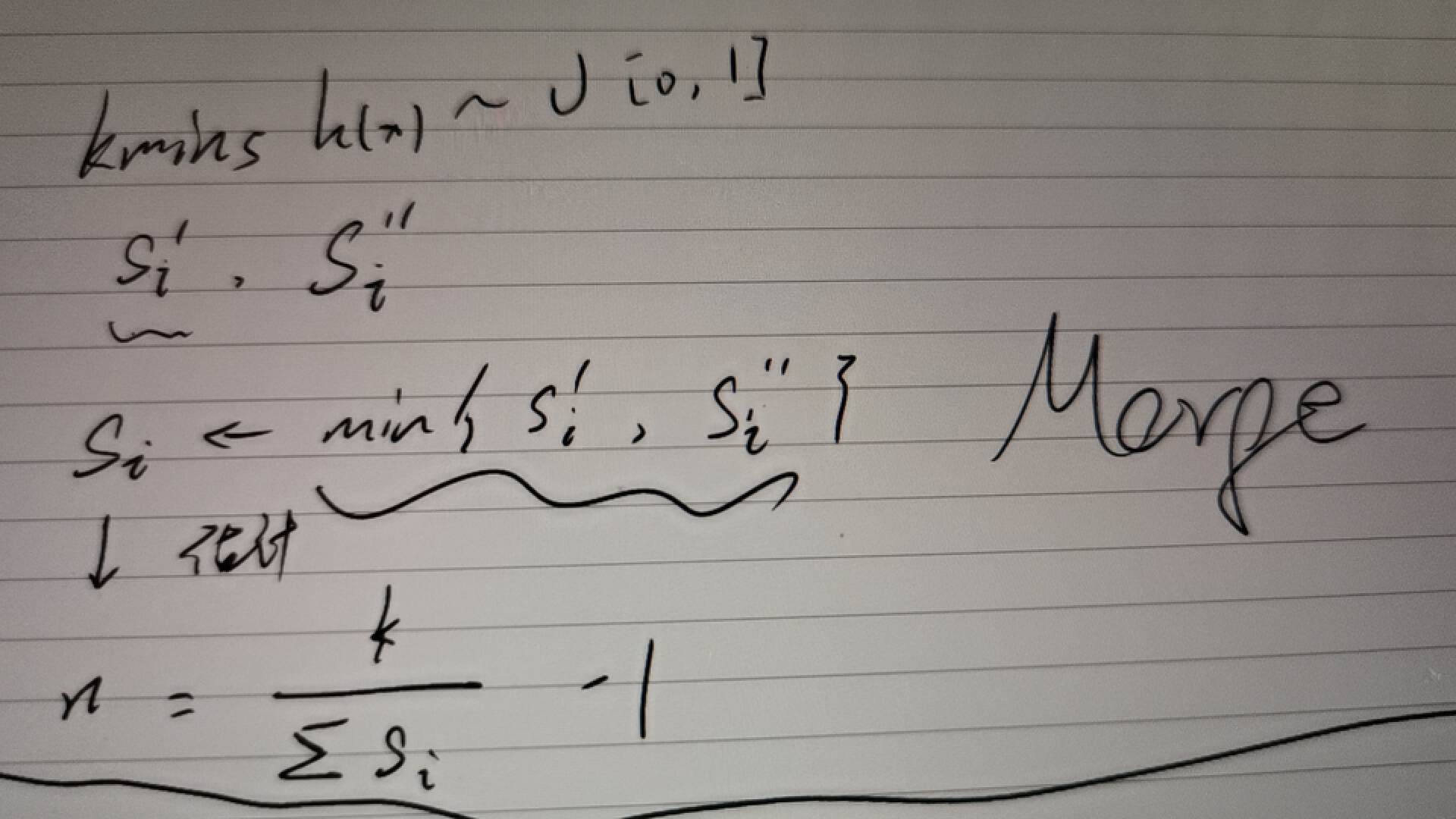 那么对于k-mins的Minhash情况,有k个minhash值,因而此上界乘以k倍,为k lnn。故期望更新次数的期望为O(k lnn)。