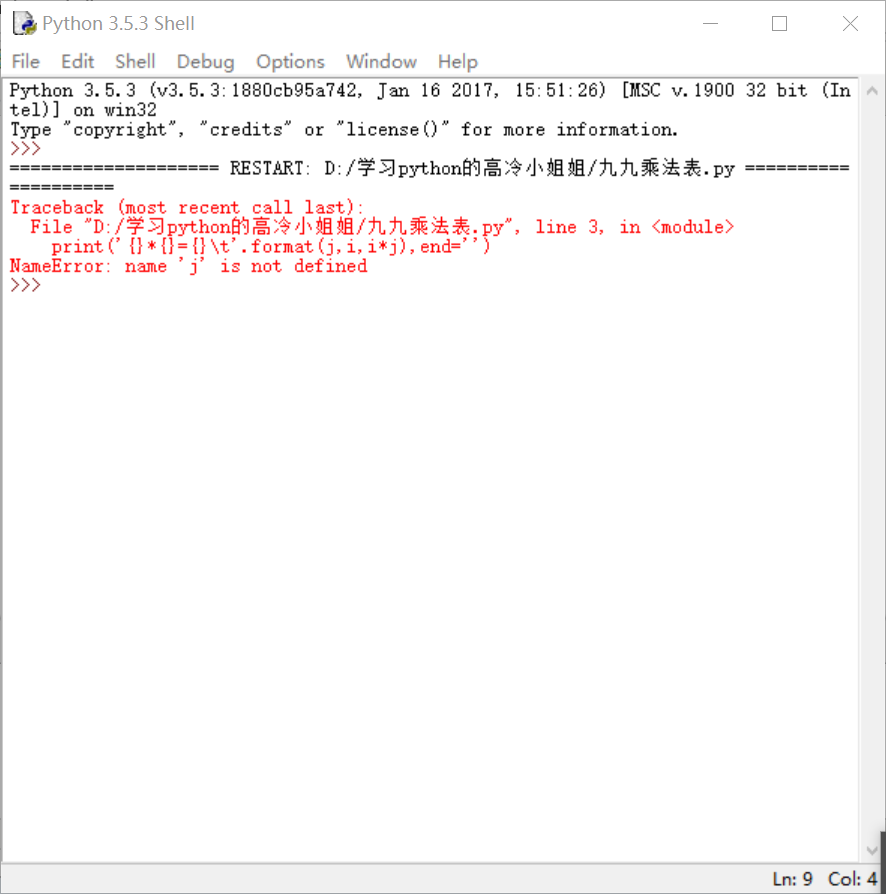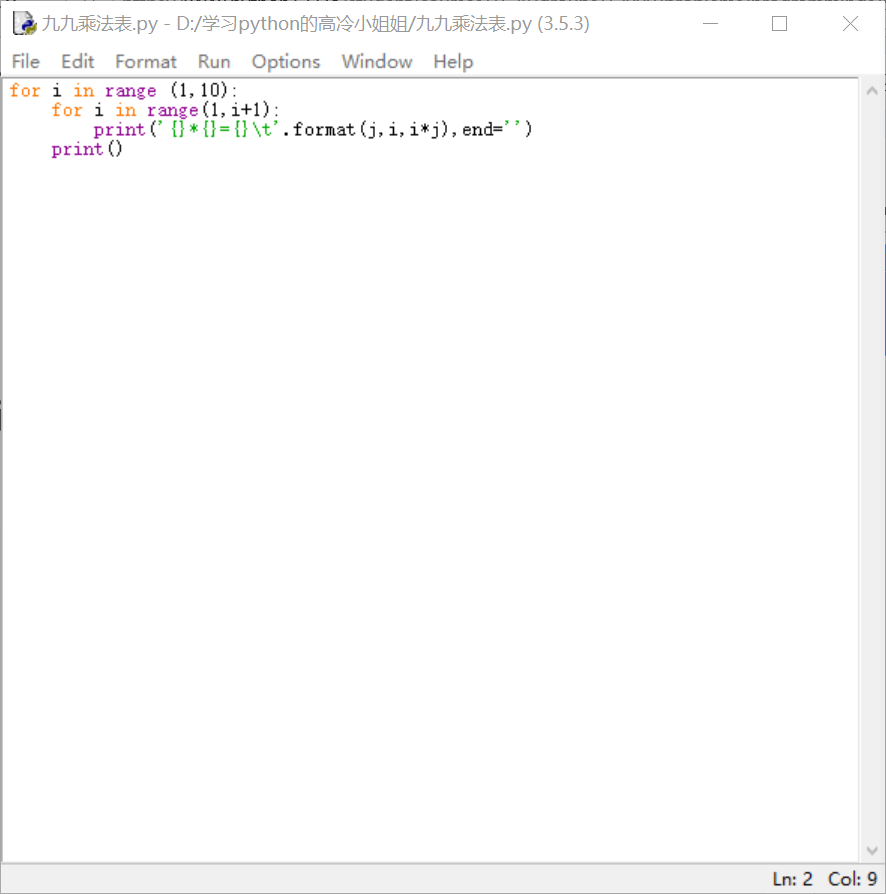 将“for j in range(1,i+1):”输入成“for i in range(1,i+1):”,具体如下。