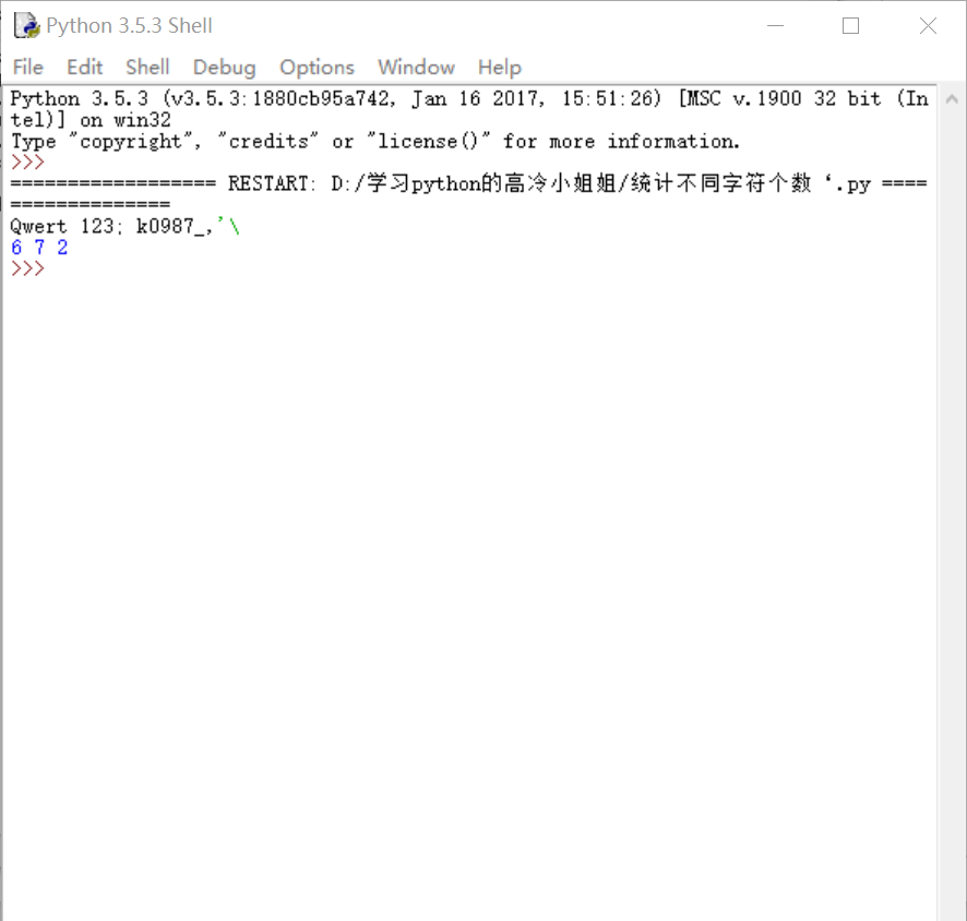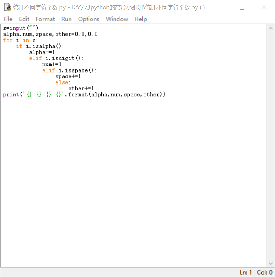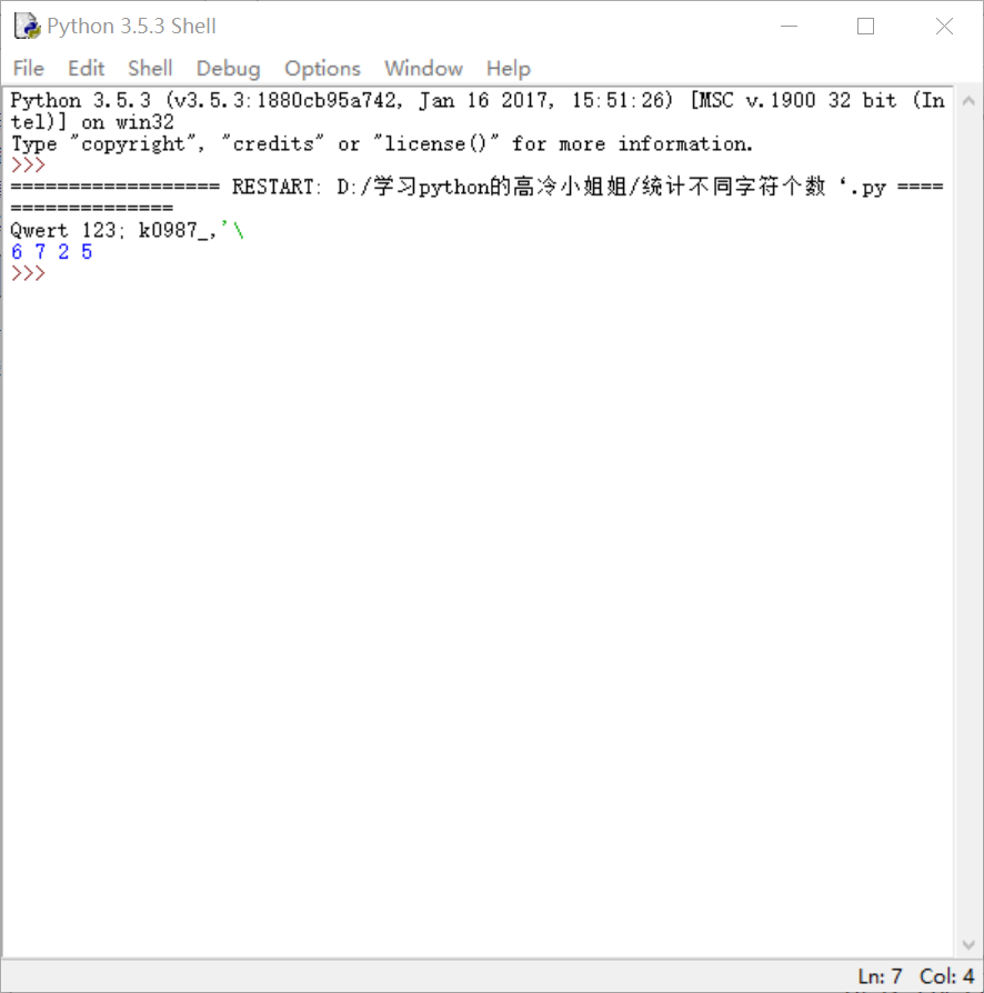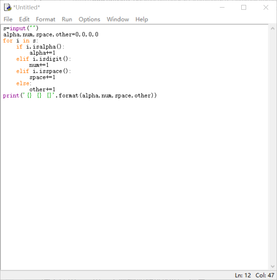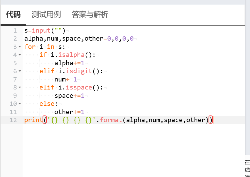 输出:按照顺序输出字母,数字,空格,及其他字符的个数,个数以空格分隔