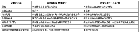 通过阅读各位神牛的著作以及文献资料,得知早期设计网络通信服务时有过争论,就是网络层应该向传输层提供面向连接的可靠服务,还是提供面向无连接的、简单灵活的、尽最大努力交付的不可靠服务。前者的典型就是有线电话机,后者就是今天的互联网,之所以选择后者来设计网络层,因为电话机非常简单,没有处理各种问题的能力,而计算机有很强的差错处理能力。基于电信网的电话通信的服务器造价很高,而网络层不提供服务质量承诺的设计造价就非常低了,而且能够适合各种应用场景,幻想如果互联网采用电信网的设计,今天你到ISP购买宽带服务,百兆/年的带宽至少要上万了,所以我们应当感谢当初前辈们的英明决策,下图是对上述两种网络服务的比较。