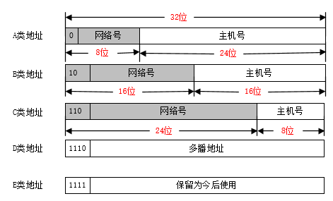如上图所示,IP地址分为A\B\C\D\E五类,其中A\B\C三类IP都是单播地址(一对一通信),D类IP是多播地址(一对多通信)。五类地址的前面有长度不等的类别位,即标识所属类别。由于无分类IP地址的广泛应用,已经不再区分A类、B类和C类地址,不过为了更好的理解和了解技术发展的演进过程,所以还是要了解IP分类。