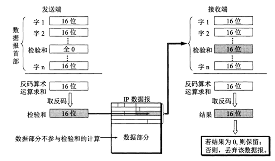 为了提升效率,IP首部的检验和不采用复杂的CRC算法,而是采用反码算术运算。其过程如下图: