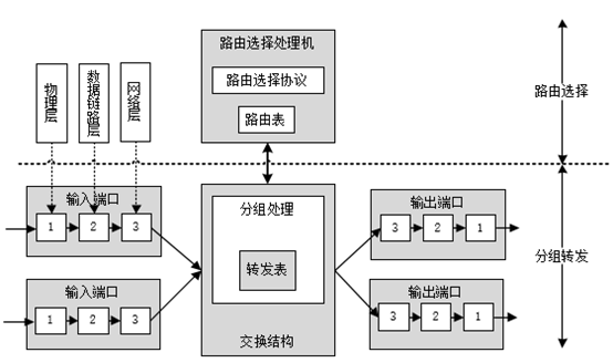 b) 分组转发部分又由三部分组成:交换结构、一组输入端口和一组输出端口