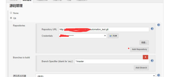 2. 源码管理配置:本地代码使用git进行管理,所以需要填写git地址和用户