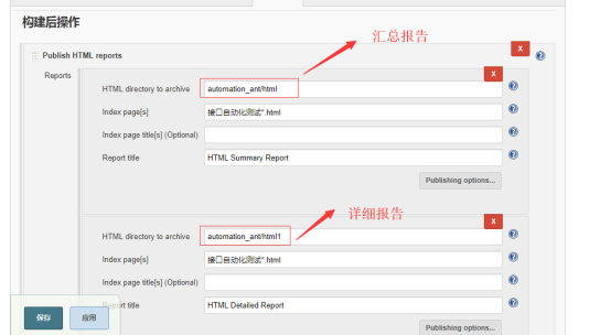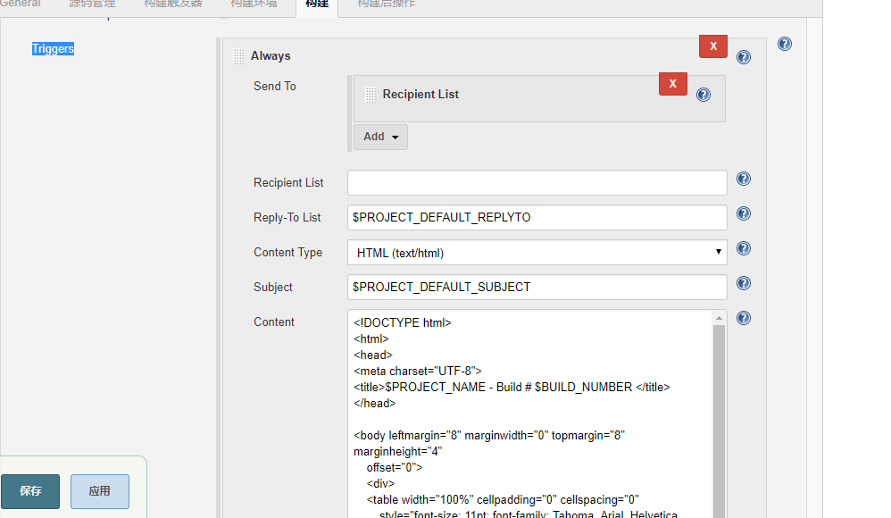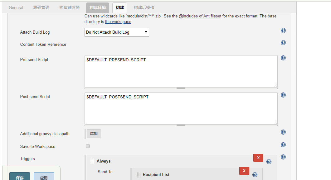 4. 构建后操作配置:配置完成,点击应用然后点击保存按钮,配置成功