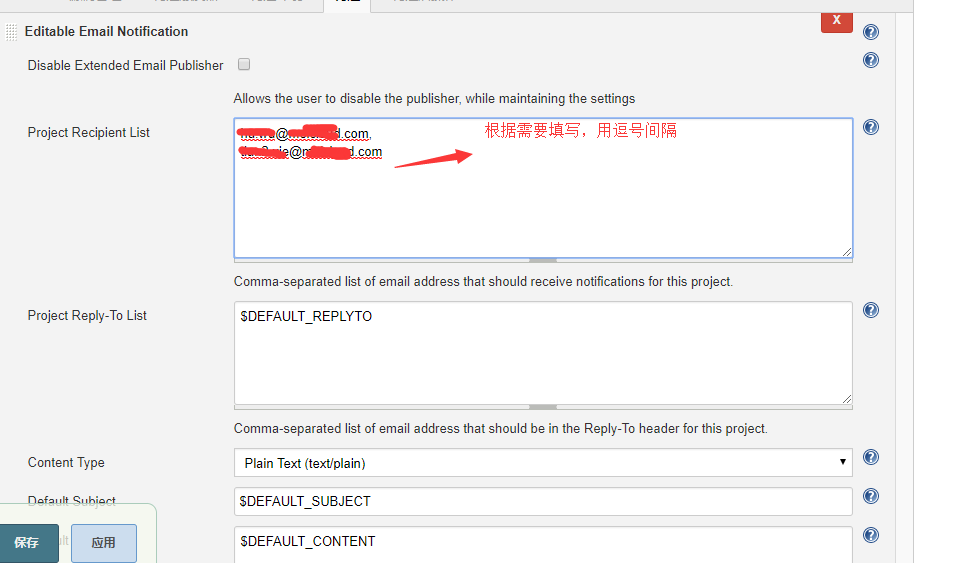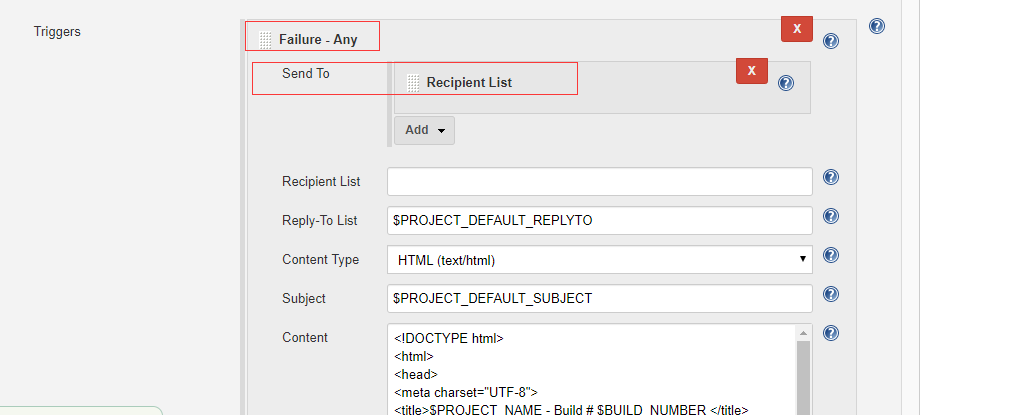 还需要把邮件发送触发条件Triggers改成Failure-Any,然后添加收件人列表,如下图