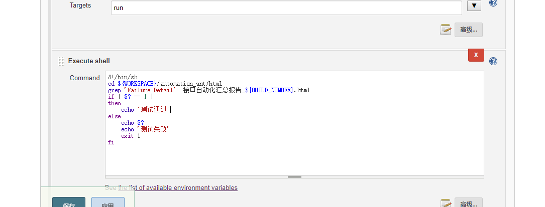 | grep ‘Failure Detail’ 接口自动化汇总报告_${BUILD_NUMBER}.html | 该命令是查找报告中有无’Failure Detail’字段,有则证明案例有失败,返回0,无则返回1; |