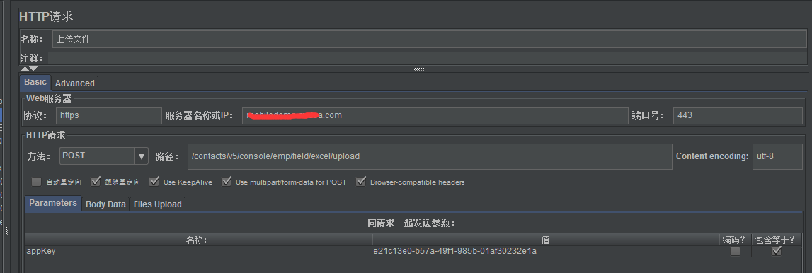 5. 脚本需要修改Parameters中的appKey参数,该参数为应用id,还需要修改File Upload下的文件参数路径,修改成了相对路径,并且兼容windows和linux环境,并且删除了公共的协议、服务器、端口如下: