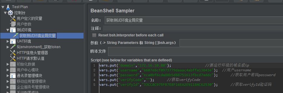 在介绍一个好用的功能,只需要在用户定义变量申明要测试的环境,不用为每次切换环境,而要修改很多全局变量而头疼,使用If控制器读取变量,就可以让脚本自动读取需要测试环境的变量,如下: