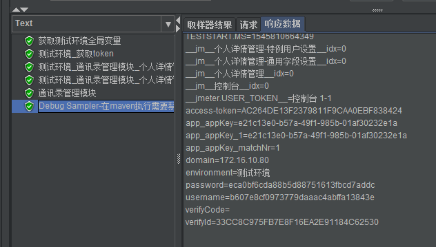 5. 根据以往的案例开发经验,调试报错,多半是变量为空、请求方法不正确,文件路径不正确,或者格式不正确导致,所以多用下Debug Sampler,该元件可以查看到所有变量