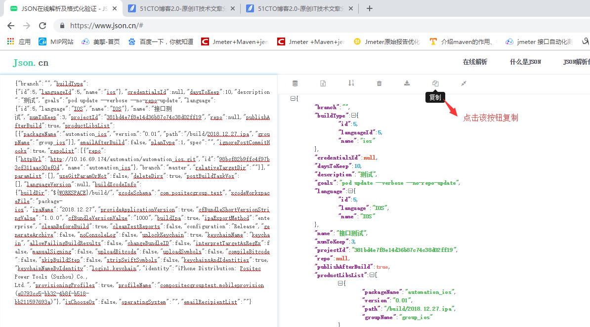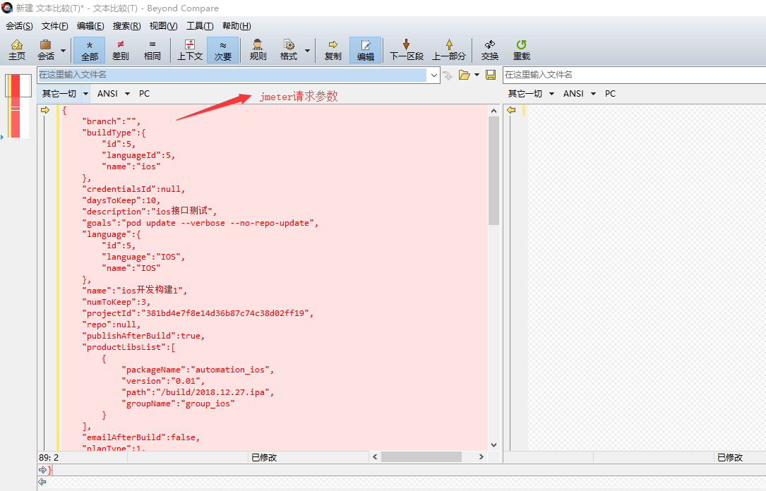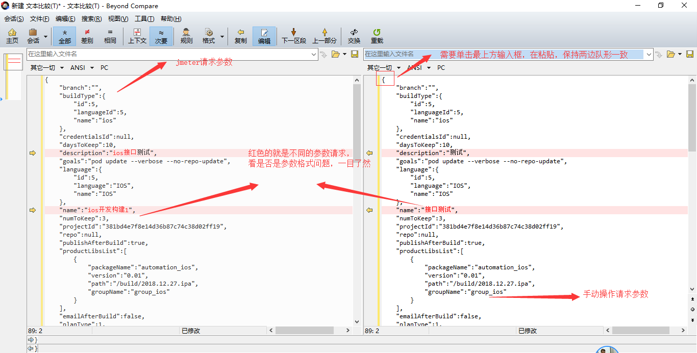 6. 有小伙伴会说,如果请求的参数太多,怎么对比,看起来会头晕,别怕,这里介绍一款工具给你,BCompare–代码比对工具,如果要比对的请求是json格式,首先需要进行格式转换,转换地址https://www.json.cn ,首先获取jmeter请求参数,转换完成,复制到compare文件对比框中,如下图所示