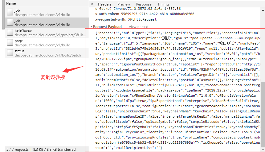 7. 然后通过手工请求,获取请求参数,这里可以直接使用F12调试,获取实际请求参数就行,不用通过fiddler获取,拷贝请求参数,因为是json格式,还是需要通过格式转换,如图所示