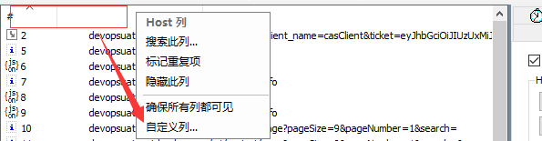 4. 图中请求未区分get、post等请求类型,可添加列名进行区分,如下: 右键点击红色区域,然后点击自定义列