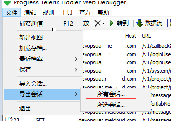 1. 抓包完成,可以把所有请求保存成har包格式,方便日后使用,点击文件》导出会话》所有会话