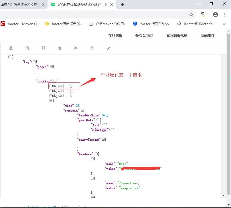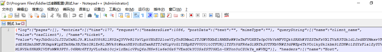 2. 然后可以使用Edit打开该文件,然后复制请求到 JSON在线解析及格式化验证 进行转义,一个Object代表一个请求,性能和自动化脚本就可以参照该请求进行开发
