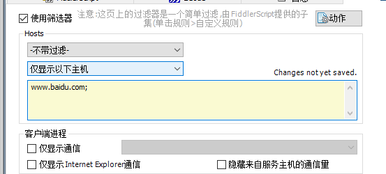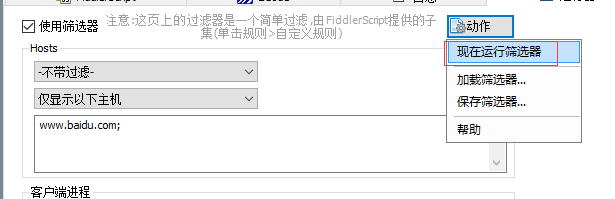 1. 点击过滤器,然后勾选使用筛选器,依次选择不带过滤、仅显示以下主机,输入要抓取的域名地址,如www.baidu.com,如果有多个地址,用;间隔