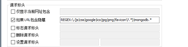 4. 编写规则:使用正则表达式,如果需要过滤其它以.img结尾的请求,只需要在favicon后面添加|img即可,如果是其它不以"."格式结尾的请求则需要在()末尾另起一行,添加|mongodb.*,该效果为过滤所有以mongodb结尾的请求: